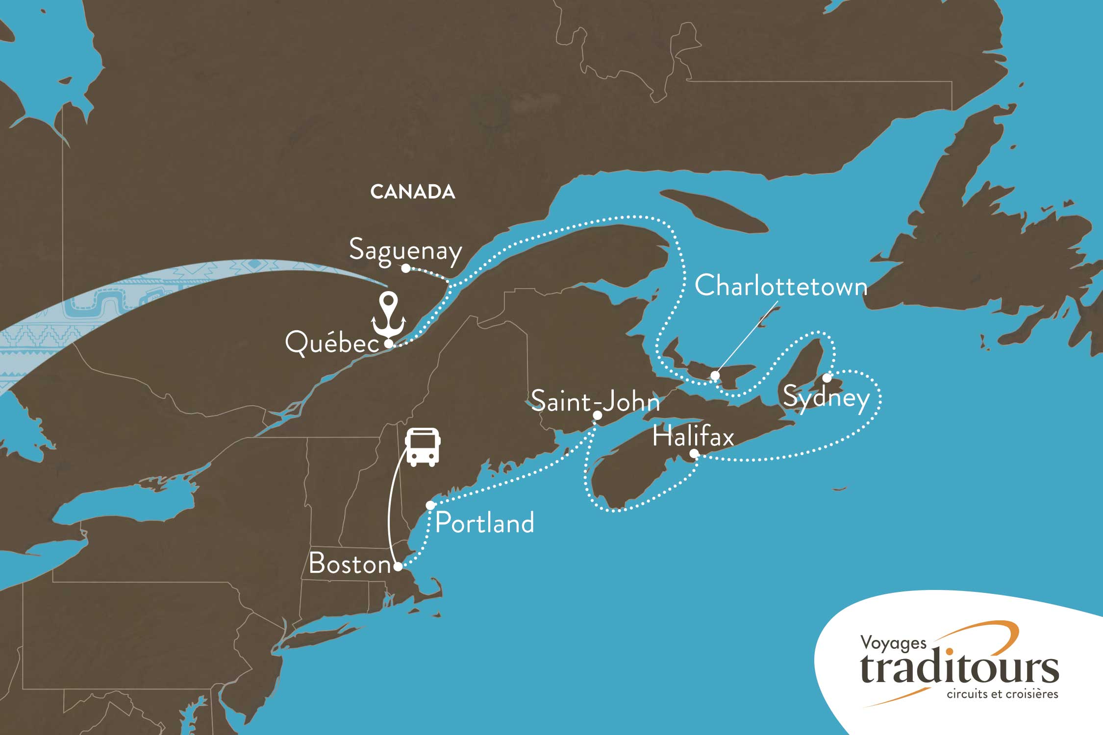 NOTES : Ce programme a été établi longtemps à l’avance en fonction des impératifs locaux connus. Des modifications peuvent donc survenir en raison de divers facteurs opérationnels, logistiques ou toute autre raison hors du contrôle de Voyages Traditours. Les compagnies de croisière se réservent le droit d’ajuster l’ordre des escales, de remplacer une destination ou d'adapter la durée des arrêts en fonction notamment des conditions de navigation et météorologiques. Ces changements peuvent être nécessaires en fonction des exigences portuaires, des décisions des armateurs ou d’autres impératifs jugés essentiels au bon déroulement du voyage. Voyages Traditours se réserve aussi le droit d’apporter des ajustements au programme, afin de garantir la meilleure expérience possible.