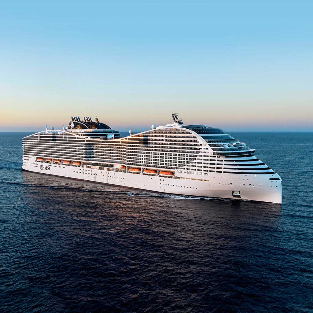 MSC World Europa a été le premier navire propulsé au Gaz Naturel Liquéfié (GNL) de la flotte de MSC Croisières. Il est équipé d'un système de traitement des eaux usées de nouvelle génération, ainsi que d'autres technologies qui réduisent son impact environnemental. Ce navire détient toutes les options de divertissement et de restauration d'un niveau supérieur, avec un vaste choix de nouveaux lieux et activités à thème. La taille accrue des navires de la classe MSC World permet d'avoir des zones ou des quartiers complètement distincts, chacun avec sa propre ambiance et ses expériences uniques, d'un lieu tranquille pour les adultes à une promenade animée partiellement ouverte avec des divertissements, des bars, des magasins et des boutiques de luxe. MSC World Europa propose également un large éventail de catégories de cabine pour satisfaire tous les goûts. Vous pourrez également vous offrir un moment de détente dans le MSC Aurea Spa, un luxueux spa balinais. Composé d'un espace thermal, d'une salle de sport, d'un salon de beauté et d'un salon de coiffure, il propose une multitude de soins de bien-être et de beauté pour vous faire relaxer, vous faire choyer et vous revitaliser. Inauguré en décembre 2021 — Tonnage 215 860 — Capacité 6760 passagers