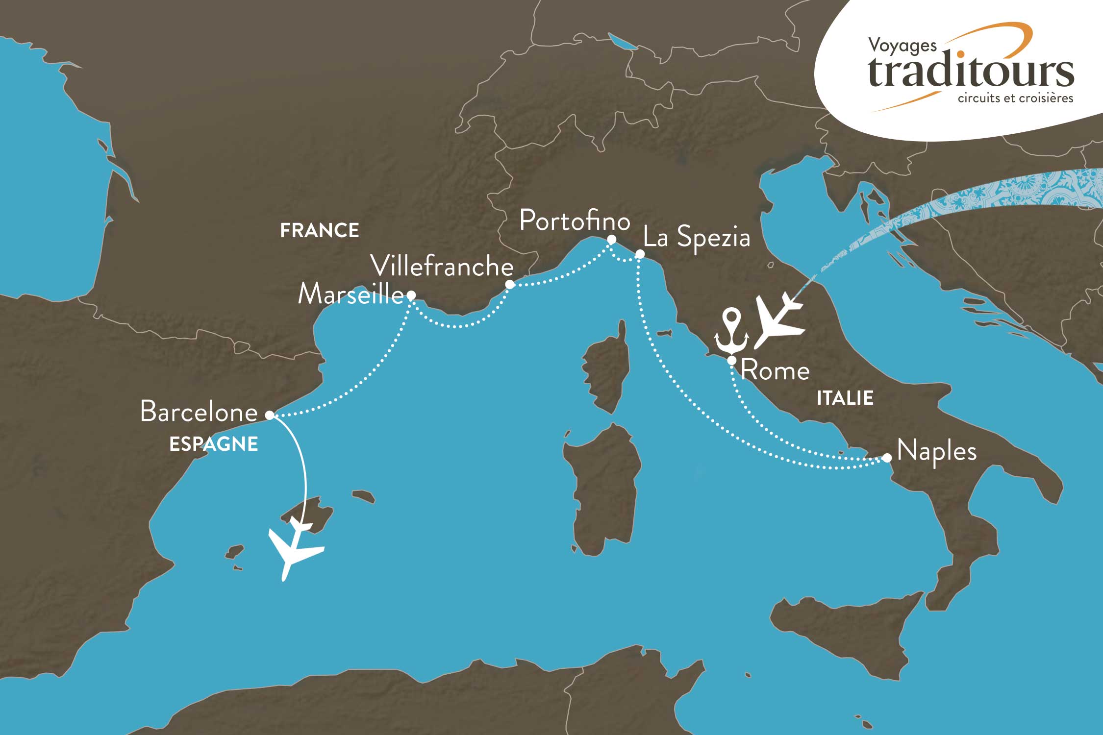 NOTES : Ce programme a été établi longtemps à l’avance en fonction des impératifs locaux connus. Des modifications peuvent donc survenir en raison de divers facteurs opérationnels, logistiques ou toute autre raison hors du contrôle de Voyages Traditours. Les compagnies de croisière se réservent le droit d’ajuster l’ordre des escales, de remplacer une destination ou d'adapter la durée des arrêts en fonction notamment des conditions de navigation et météorologiques. Ces changements peuvent être nécessaires en fonction des exigences portuaires, des décisions des armateurs ou d’autres impératifs jugés essentiels au bon déroulement du voyage. Voyages Traditours se réserve aussi le droit d’apporter des ajustements au programme, afin de garantir la meilleure expérience possible.