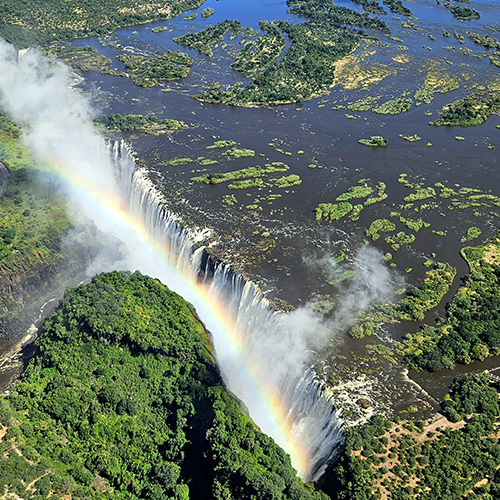 Déjeuner. Transfert à l’aéroport de Johannesburg et envol à destination de Victoria Falls, au Zimbabwe. Arrivée et dîner selon l’horaire du vol. Départ pour la visite à pied, côté Zimbabwe, des célèbres chutes Victoria. David Livingstone, médecin et missionnaire écossais, fût le premier Européen à les découvrir en 1855 au cours d’une de ses nombreuses expéditions. Sur un front de 1 700 m de large, des colonnes d’écumes s’abîment dans un grondement qui semble venir des profondeurs de la terre, d’où l’origine de son nom local Mosi-oa-Tunya, qui signifie « la fumée qui gronde ». L’explorateur les rebaptisa « chutes Victoria » en hommage à sa reine. Route en direction du parc national de Chobe, au Botswana. Installation, souper et nuit au lodge.