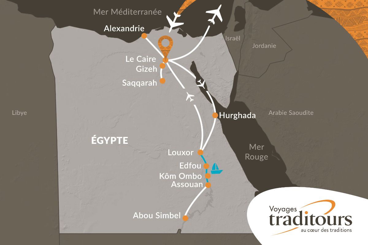 Rencontre avec notre accompagnateur de l’équipe Traditours à l’aéroport de Montréal. Assistance aux formalités d’enregistrement et envol pour Le Caire, en Égypte. Repas et nuit à bord de l’avion.