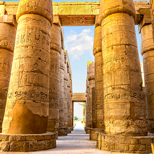 Déjeuner. Départ en autocar afin de nous rendre à Louxor. Arrivée, embarquement sur notre bateau de croisière et installation dans nos cabines. Dîner à bord. Notre après-midi débutera par une excursion sur la rive est de Louxor avec, entre autres, le souk pour y découvrir son animation et ses couleurs. Nous poursuivrons notre visite avec celle du temple de Karnak, domaine du dieu Amon, que les pharaons successifs se sont évertués à embellir. Nous serons émerveillés par cet ensemble architectural dont la construction s’étala sur plus de 2 000 ans. Puis, nous visiterons un institut de papyrus où les principes de fabrication, inventés il y a environ 5 000 ans, nous seront dévoilés. Nous assisterons également à une démonstration de l’utilisation des hiéroglyphes; ce système d’écriture figurative dont les caractères représentent des objets divers naturels ou fabriqués par l’homme. Retour au bateau. Souper et nuit à bord.