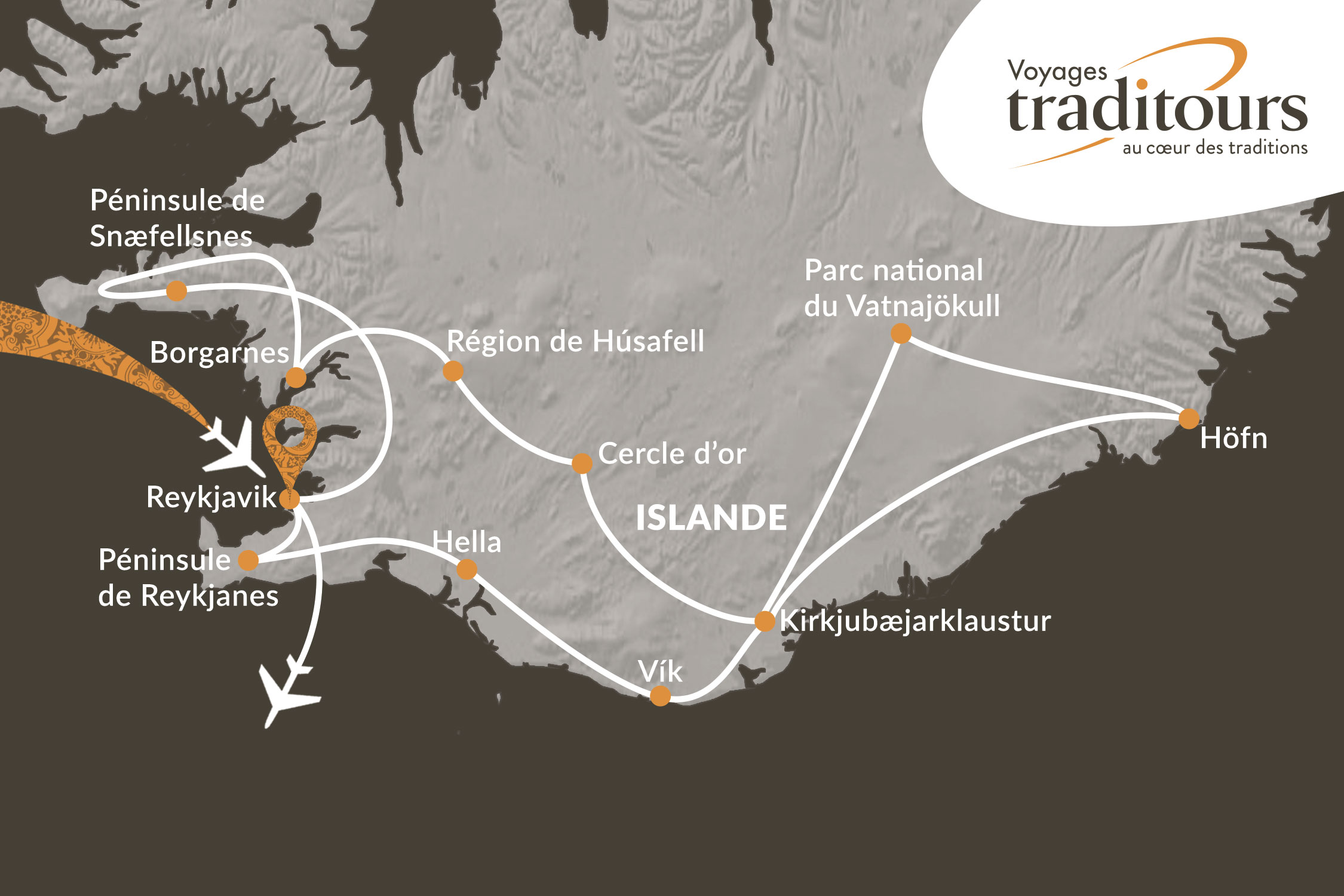 Déjeuner. Ce matin, nous nous arrêterons aux magnifiques cascades Hraunfossar et Barnafossar, dont l'eau est d’une couleur unique. S’en suivra une randonnée dans la nature sauvage islandaise au coeur de la vallée de la région de Húsafell. Dîner boîte à lunch en cours de randonnée. Puis, départ vers le « Cercle d’or » afin d’y voir trois de ses sites les plus connus. Nous débuterons par la faille de Þingvellir, à la frontière des plaques tectoniques nord-américaine et eurasienne. Cet endroit historique fut le lieu de rassemblement du plus vieux parlement du monde entre 930 et 1799. Nous observerons par la suite l’un des phénomènes géologiques des plus impressionnants : les geysers. Nous irons voir celui de Strokkur, qui nous offrira un spectacle grandiose. Enfin, nous admirerons l’impressionnante cascade de Gullfoss, se trouvant sur l’une des rivières glaciaires d’Islande. Transfert, installation, souper et nuit à l’hôtel dans le Cercle d’or.
