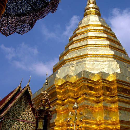 Déjeuner. Transfert à l’aéroport de Bangkok selon l’horaire du vol. Envol à destination de Chiang Maï, ville surnommée la « Rose du Nord ». Dîner. Visite du temple Doi Suthep, le plus vénéré du Nord de la Thaïlande, situé sur un site privilégié qui surplombe la ville et offre le plus beau panorama de la région. Prise de possession de notre moto. Transfert, installation, souper et nuit à l’hôtel.