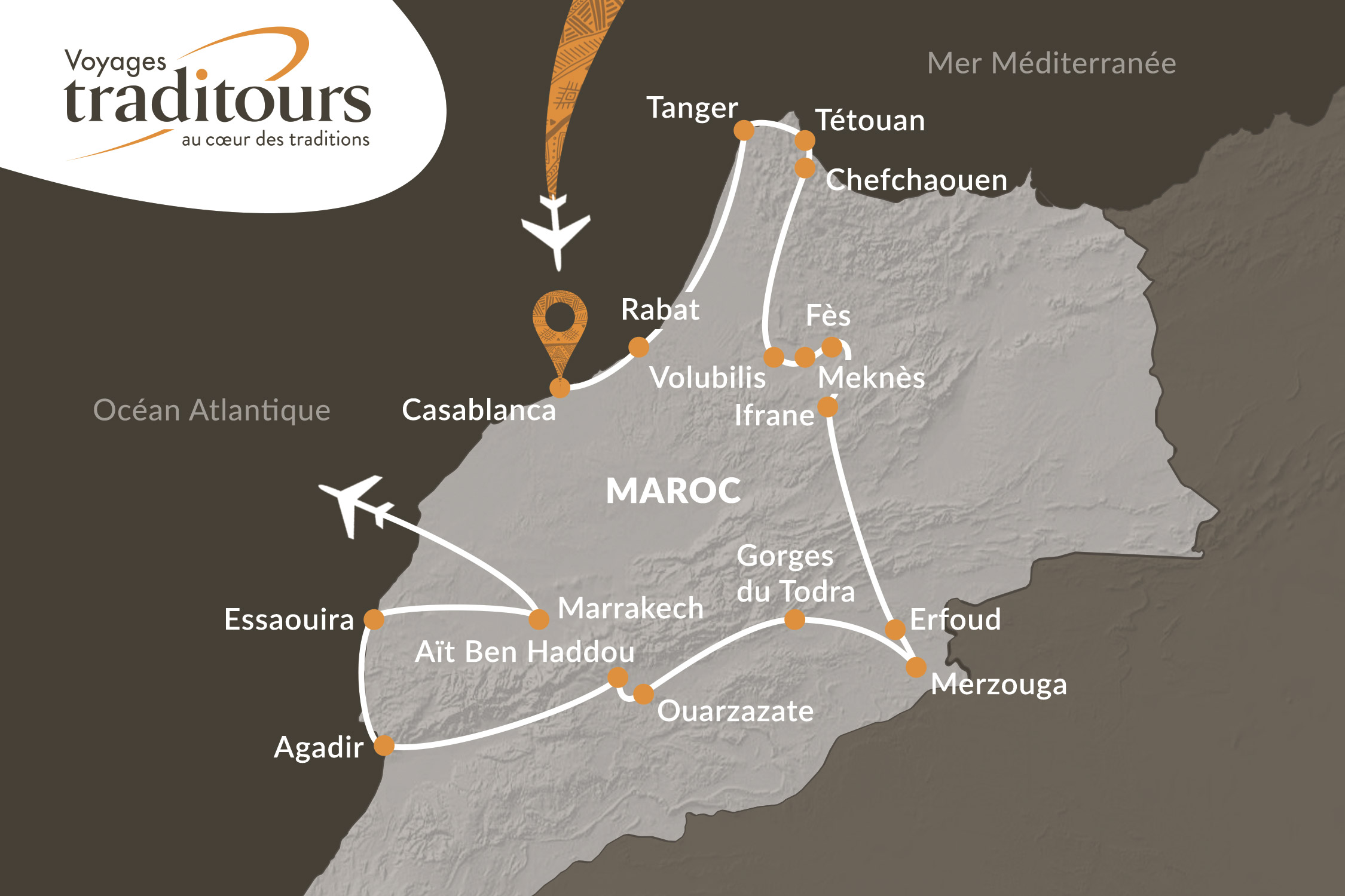 Rencontre à l’aéroport de Montréal avec notre accompagnateur de l’équipe Traditours. Assistance aux formalités d’enregistrement, puis envol à destination de Casablanca. Repas et nuit dans l’avion.