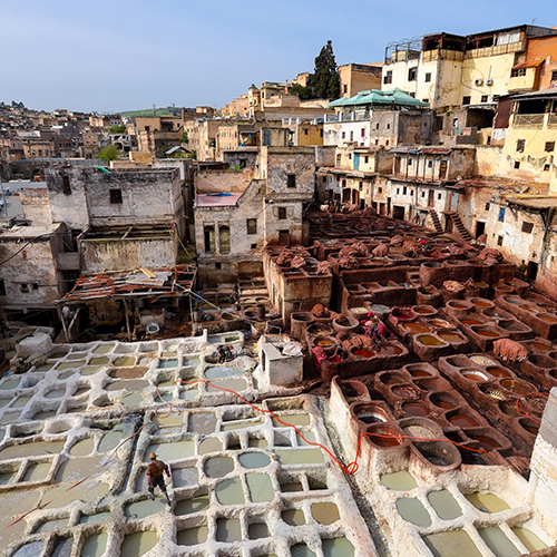 Déjeuner. Journée consacrée à la visite de la ville impériale de Fès durant laquelle nous contemplerons, entre autres, les portes en bronze du palais royal, l’ancienne médina et ses écoles coraniques, la fontaine de Nejjarine, la mosquée de Al Quaraouiyine, centre universitaire de premier ordre, ainsi que le mausolée de Moulay Idriss II. Dîner. L’après-midi sera consacré à la découverte du célèbre quartier des tanneries, véritable joyau unique au monde. Peu de choses ont changé depuis l'époque médiévale : la plupart des colorants sont toujours extraits de plantes, comme le bois de cèdre, les coquelicots ou la menthe. Nous visiterons ensuite une fabrique artisanale de céramique de Fès, réputée dans le monde entier, et aurons le plaisir de participer à un atelier de calligraphie arabe. Retour à l’hôtel. Souper. Nuit à Fès.