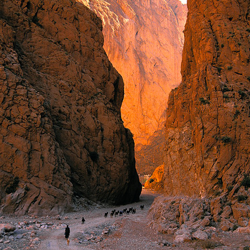 Déjeuner. Nous emprunterons une route qui serpente à travers les jolis ksars pour rejoindre les gorges du Todra, phénomène géologique à couper le souffle avec ses parois rocheuses atteignant 300 m de hauteur, ainsi que sa source d’eau limpide qui irrigue les palmeraies et les cultures de la vallée! Dîner. Poursuite vers Ouarzazate en traversant la Vallée des roses, où nous découvrirons des produits élaborés grâce à cette fleur. Arrivée, installation et souper à l’hôtel. Nuit à Ouarzazate.