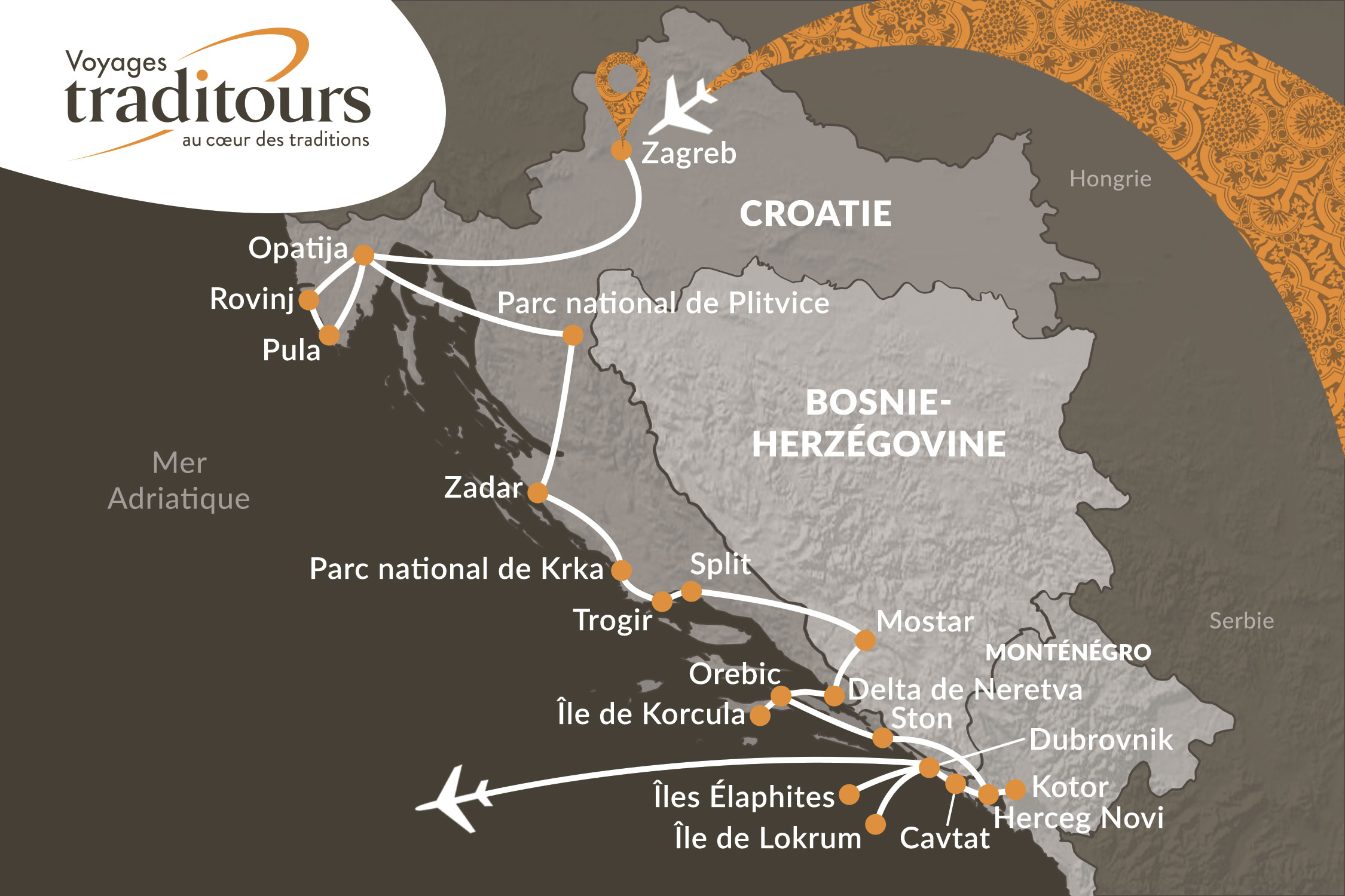 Rencontre avec notre accompagnateur de l’équipe Traditours à l’aéroport de Montréal. Assistance aux formalités d’enregistrement et envol à destination de Zagreb, en Croatie. Repas et nuit dans l’avion.