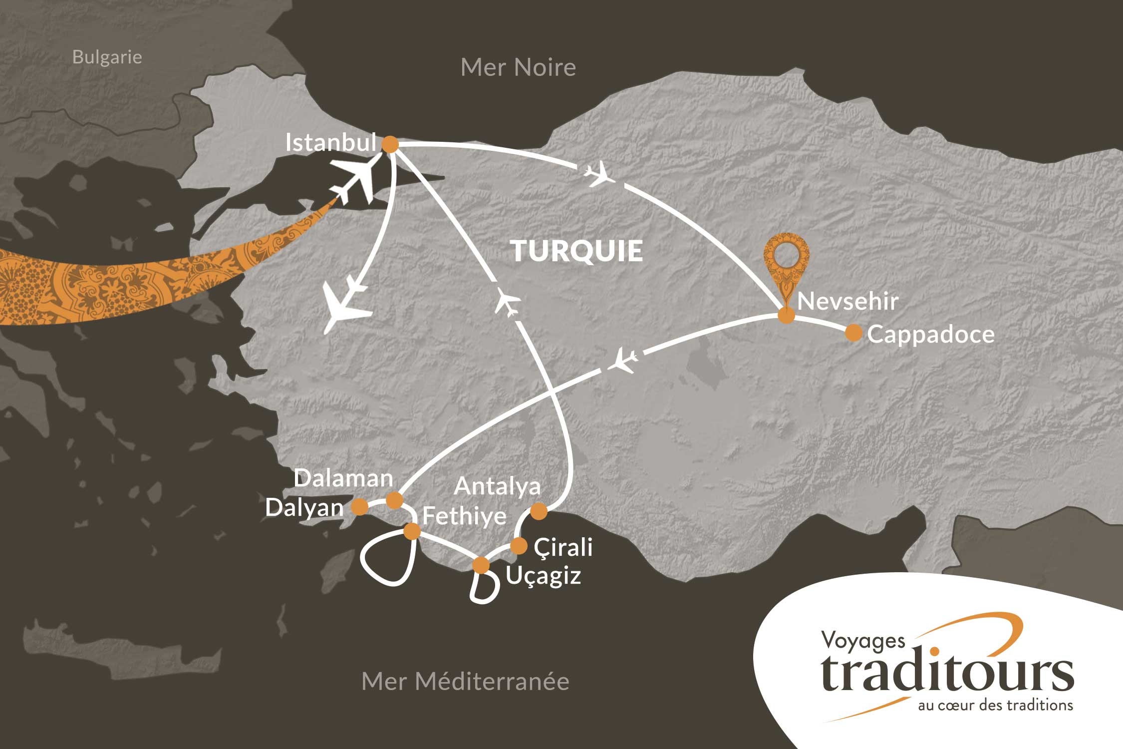 - Les 3 vols intérieurs : Istanbul / Nevsehir, Nevsehir / Dalaman et Antalya / Istanbul